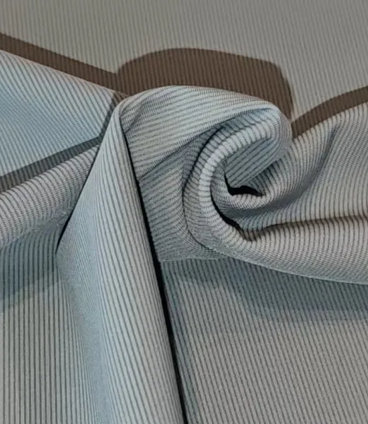 31461F Light Gray Fine Stripe Fabric features a high-performance blend of 76% Nylon and 24% Spandex, engineered for exceptional durability and elasticity. The Nylon component provides outstanding abrasion resistance, structural integrity, and smooth texture, while the Spandex ensures superior stretch recovery and comfortable flexibility. This fabric showcases a sophisticated light gray hue with precise fine stripes, offering both functional performance and aesthetic appeal through its minimalist yet elegant design.